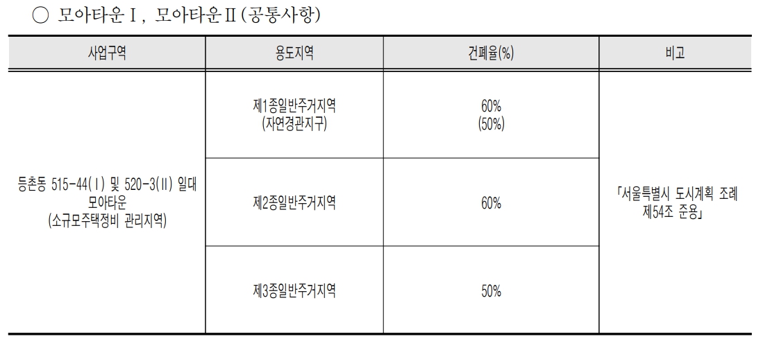 등촌2동 모아타운은 제1종, 제2종 일반주거지역 60%, 자연경관지구 50%, 제3종 일반주거지역 50%입니다.