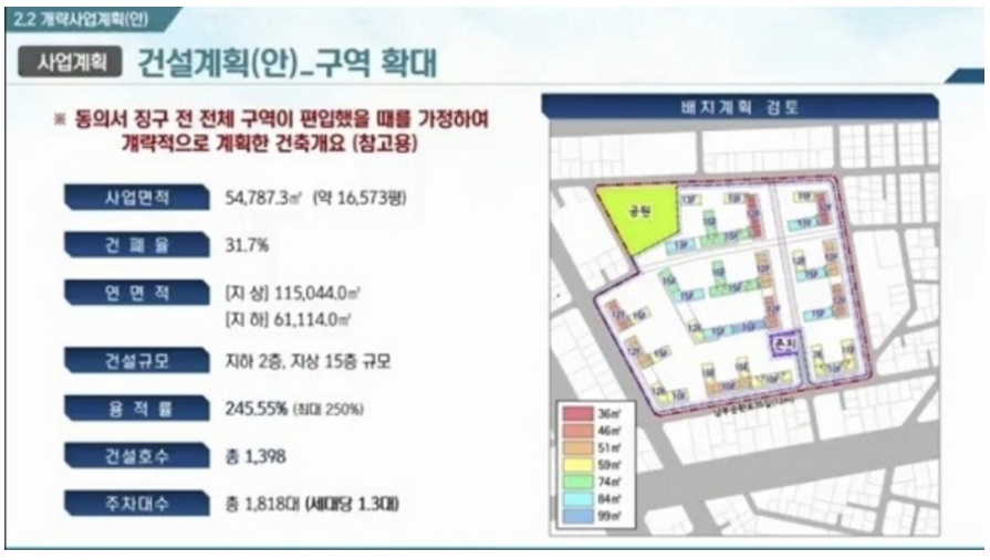 구역을 확대하게 된다면 아무래도 대로변과 접할 수 있는 부분이 생기기 때문에 훨씬 사업성이 좋아질 수는 있습니다. 기존 30,079㎡에서 54,787.3㎡로 확장되면서 세대수가 2배 가까이 증가하여 대단지 아파트로 변신이 가능합니다.